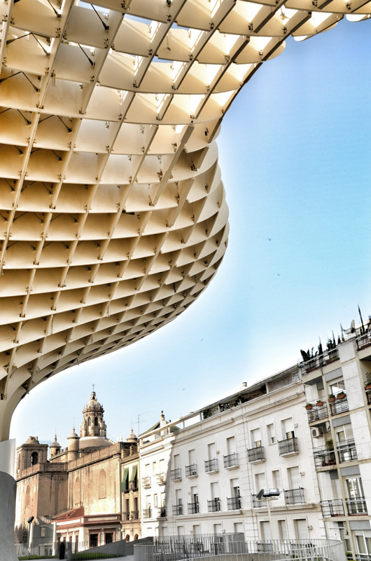 Le lendemain de notre arrivée dans la capitale andalouse, au hasard d’une balade à pied dans la ville encore somnolente, nous avons été soudainement happés par la vision incongrue d’un bras de parasol géant. Intrigués par cette étrange réalisation, nous nous sommes approchés de la Plaza de la Encarnacion pour découvrir une immense surperstructure arachnéenne au coeur de la citré traditionnelle.