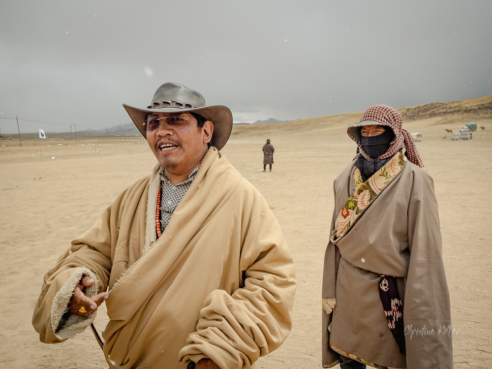 L’ambiance est bon enfant. Certains propriétaires bichonnent leurs chevaux préparés comme de véritables stars prêtes à entrer en scène ; d’autres les font marcher ou trotter pour leur délier les jambes. Un peu plus loin, les stands de nourriture et de boisson attirent gourmands et assoifés. Par petits groupes, des hommes échangent plus ou moins bruyamment des propos animés tandis que des familles restent à l’abri dans leur voiture. Et pour cause, la météo est pour le moins capricieuse. En quelques heures, éclaircies et averses de neige se succèdent quand ce ne sont pas des bourrasques de vent carabinées qui soulèvent des nuages de poussière. On comprend mieux le port de masques.