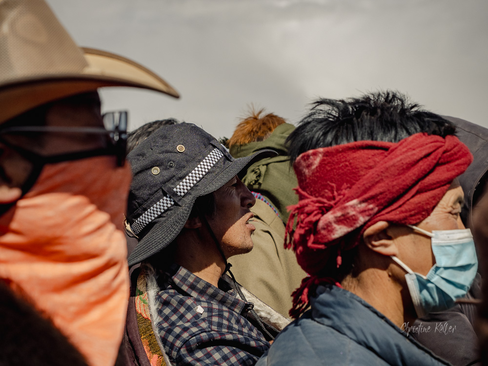 Il y a des chevaux partout, certains attachés à un pick up, d’autres tenus par leurs propriétaires. Au pied d’un gros monticule, des voitures et des véhicules utilitaires sagement alignés, comme si tout le monde avait rendez-vous ici. Sur la pente, des hommes et des femmes de tous âges se sont installés, assis ou debout, discutant tranquillement ou observant la scène. Bon nombre d’entre eux portent un masque, autant de visages effacés dans ce décor singulier de poussière. Tout semble à la fois paisible et chargé d’attente, comme si quelque chose d’important était sur le point de commencer et que nous venions, par hasard, d’en devenir les témoins privilégiés.