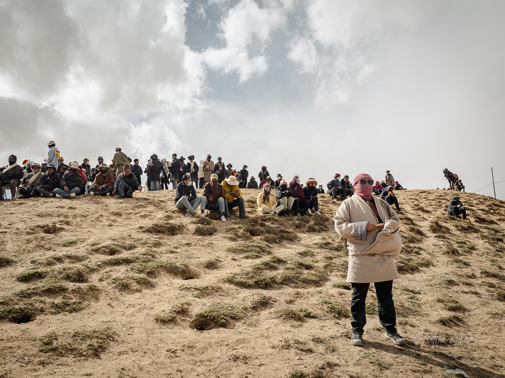 La photo nous occupe un bon moment mais le temps passe et … il ne se passe rien! Les Tibétains ne manifestent aucun signe de d’impatience mais de notre côté, la situation est toujours incertaine et après plusieurs heures d’attente, nous commençons à nous demander s’il vaut la peine de rester là. Au moment où nous n’y croyons plus, nous percevons un semblant d’agitation. Le public descend du talus et se rassemble dans la plaine. Poussés par la curiosité, nous suivons le mouvement. Un homme muni d’un micro se met à haranguer le public en cercle autour de lui. A entendre le ton de l’orateur et à voir les visages fermés de ceux qui l’écoutent, l’heure ne semble pas être à la plaisanterie. Personne ne bronche dans un silence quasi religieux. Que leur raconte-t-il ? Difficile à dire mais d’après ce que nous avons pu comprendre, il semblerait qu’avant notre arrivée, une bagarre a éclaté. Cet évènement aurait entraîné la réprobation des autorités locales, l’arrivée de la police et la suspension du déroulement de la journée jusqu’à cet interminable sermon d’un responsable régional.