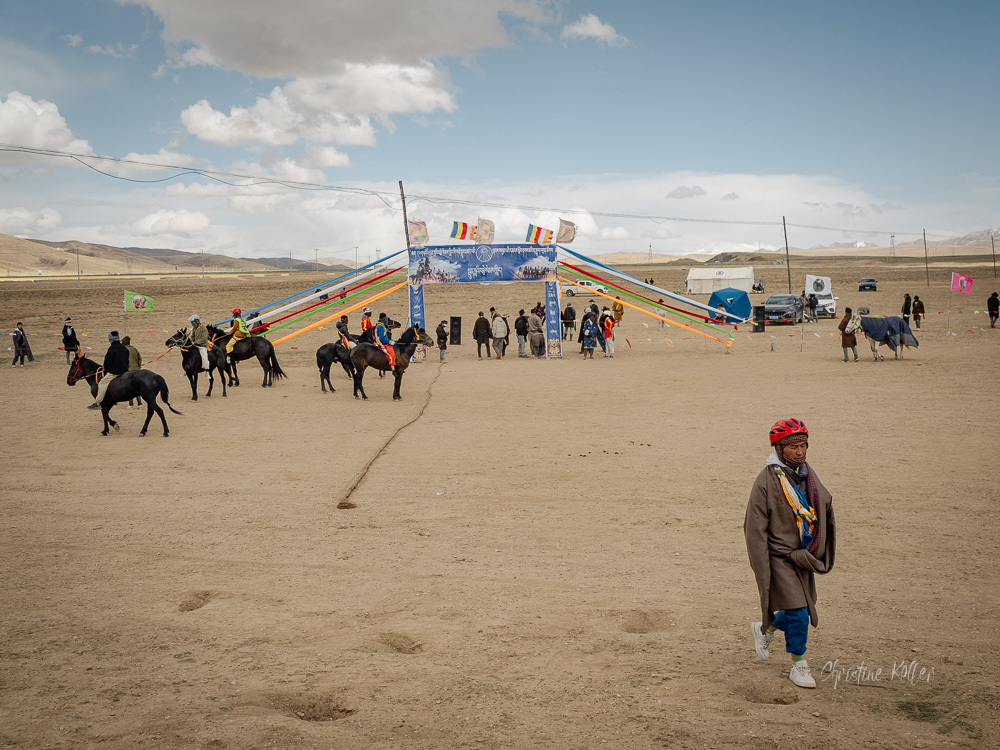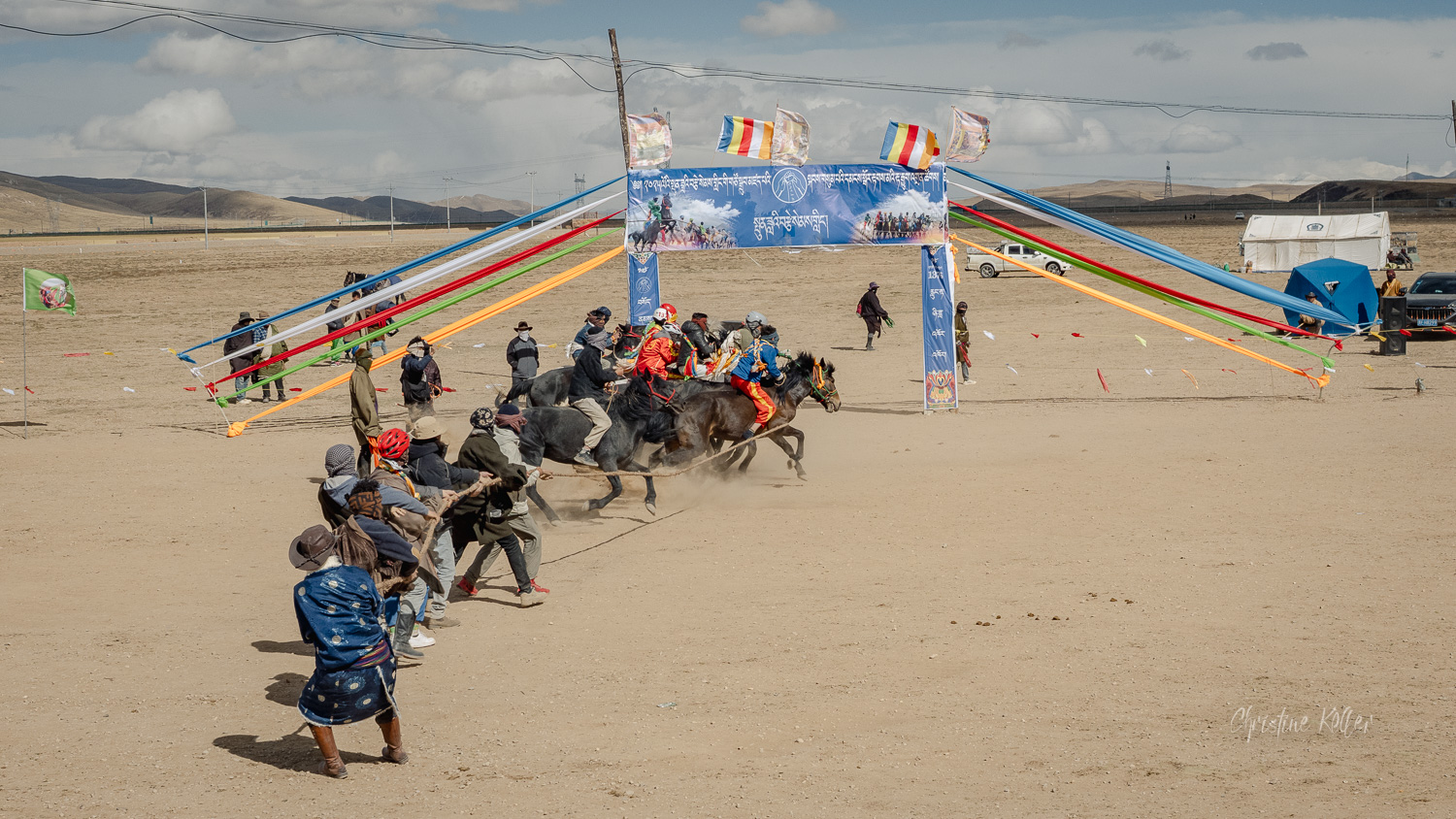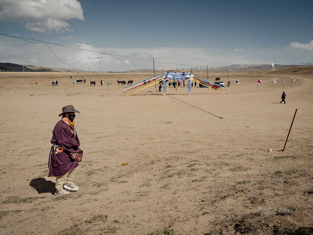 Sur la ligne de départ, c’est la pagaille. Cet hippodrome n’est pas Longchamp, une simple corde à laquelle s’agrippent plusieurs solides gaillards remplace les stalles de départ. Les chevaux, sensés s’aligner le long de la corde, se ruent surexcités sur celle-ci, se bousculent et s’emmêlent les jambes. Certains basculent même en avant se délestant dans la foulée de leur cavalier. De longues minutes et d’innombrables tentatives plus tard, le commissaire de course jugeant enfin l’alignement satisfaisant abaisse son drapeau, les gars lâchent la corde.