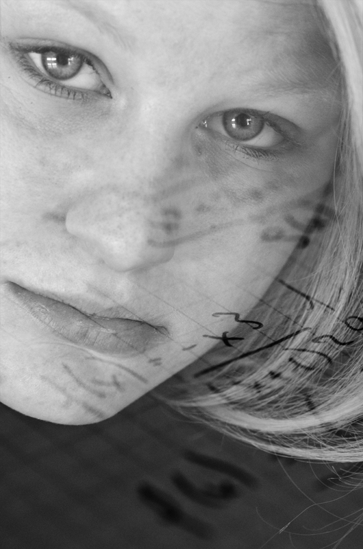Ces trois images ne sont donc pas le résultat d’un montage bricolé dans photoshop mais bien des surimpressions. Elles ne me satisfont pas vraiment mais faute de pouvoir tenter d’autres essais et pour répondre à Donlope dans les délais, je vous présente quand même le résultat de mes premières expérimentations. Sur les deux premières photos, les chiffres et les lettres sont bien visibles. Néanmoins, le fait que Miss Blondette ait enfoncé son menton dans son col roulé noir donne un résultat étrange, comme s’il lui manquait un bout du visage (je ne m’en suis rendue compte hélas qu’après avoir déchargé ma carte sur mon ordi). La troisième est nettement meilleure de ce point de vue et l’image est moins grisouille. Malheureusement, les équations apparaissant mal, le thème n’est pas vraiment respecté, raison pour laquelle je ne l’ai pas retenue pour le projet.