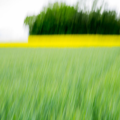 Et bien Marie puisque tu me poses la question, allons-y. Je suis plus rat de champs que rat des villes. J’ai toujours aimé me balader en campagne. Elle m’apaise, me ressource. A fin mai,elle était particulièrement lumineuse dans ma région avec tous les champs de colza en fleurs. Au départ, je savais que je voulais faire des photos en jaune et vert et au format carré mais n’avais pas du tout prémédité de faire des flous. Comme je trouvais mes 1er essais de photos « normales » peu séduisants car trop rigides (les cultures sont très géométriques chez moi)et peu poétiques, j’ai eu envie de donner du mouvement à mes images. J’ai commencé à bouger mon appareil de bas en haut en utilisant une vitesse plutôt lente et en fermant le diaphragme (le plus souvent f16). J’ai été nettement plus convaincue par le rendu des diverses zones de couleurs qui se fondaient mieux l’une dans l’autre, ondulaient comme si la campagne dansait. J’ai eu envie de retranscrire ma promenade un peu à la manière d’une partition musicale, avec des mouvements parfois amples et lents (largo) qui balaient la plaine, tantôt plus rapides lorsque je pénètre dans un petit bois. Malgré le ciel bien sombre, ces photos ne sont pas menaçantes pour moi mais à la fois apaisantes et dynamiques. C’est à dessein également que je n’ai introduit aucun personnage dans mes images. Même si j’ai croisé un ou deux promeneurs, j’avais l’impression d’être seule au monde, entièrement absorbée dans cet univers végétal, particulièrement lumineux sous un ciel chargé. Encore une petite précision, l’ordre dans lequel je présente ces photos n’est pas indifférent. Il retrace dans les grandes lignes mon parcours (d’abord dans la plaine,puis l’approche d’un bosquet, ensuite dans le bosquet, etc…).Voila tu sais tout!