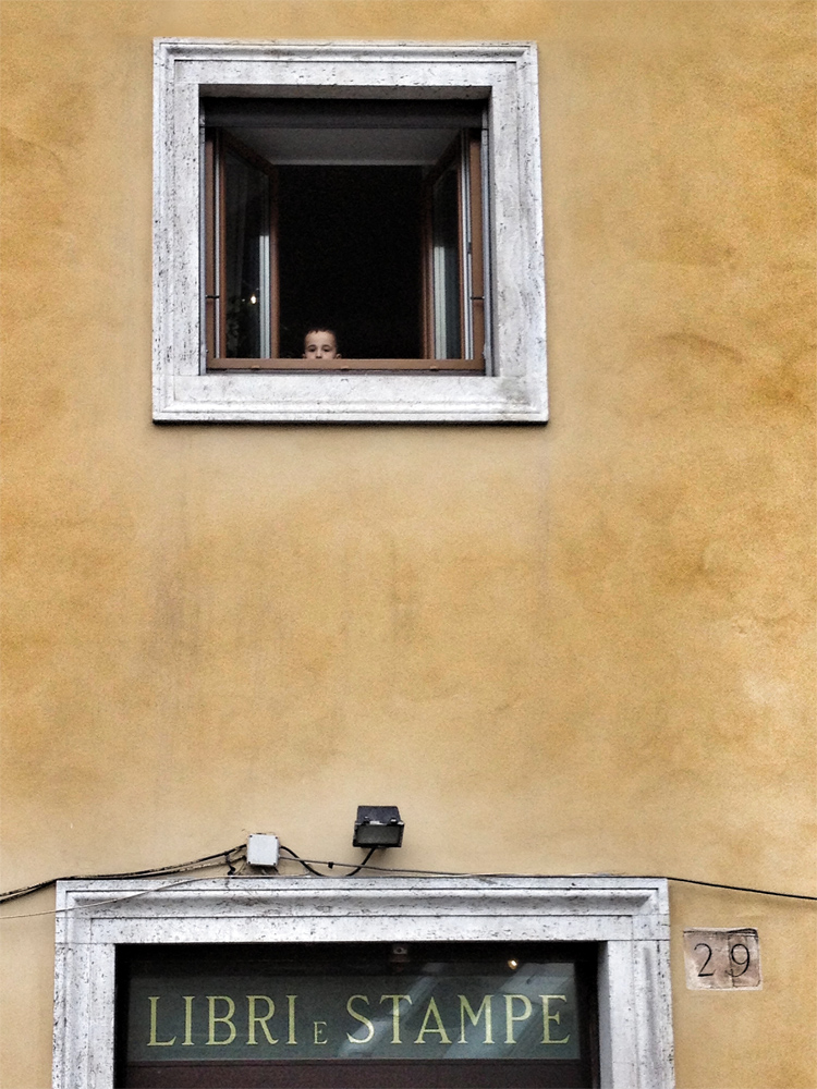 @Tous: En me baladant dans les rues de Rome (Oui Lucie, je rôde beaucoup ces temps-ci ;-)), j’avais repéré la façade ocre du bâtiment et la vitrine de la librairie devant laquel tronait une belle vespa jaune. J’avais envie de prendre une photo mais en attendant que le feu passe au vert au passage piéton, j’ai aperçu le petit garçon à sa fenêtre et ai changé d’idée pour me concentrer sur ce petit bonhomme assez mutin je dois dire. Il m’a très vite repérée et a appelé la petite fille en rose qui est elle aussi apparue dans le cadre. La scène a duré moins de deux minutes mais tous deux étaient plutôt démonstratifs. Ah ces italiens, ils ont vraiment la comedia dans le sang! Merci beaucoup pour toutes les idées en « -ité » que vous m’avez suggérées.Votre créativ-..ité m’enchante! A mons avis, la théâtralité convient tout à fait à l’ensemble de la série plutôt qu’uniquement à la dernière photo sur laquelle les deux enfants ne sont pas vraiment très expressifs. La fraternité me plaît bien mais je me demande si en regardant uniquement cette image, elle nous évoque vraiment la fraternité.Je n’accroche par vraiment à la subtilité et à la félicité par contre la volubilité colle assez bien me semble-t-il. La maturité, eu égard à l’air suffisant de la fillette, est bien trouvée également. Et finalement grâce à toute cette émulation, j’ai pour ma part pensé à « altérité » pour ce face à face enfantin. Encore une fois merci d’avoir si bien joué le jeu et à très bientôt.