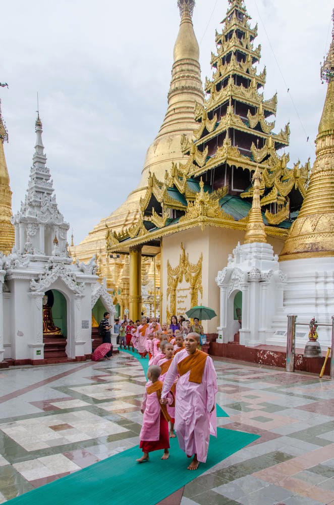 Le Shwedagon ne se résume pas en l’énumération, forcément réductrice, des richesses qui le constituent. C’est bien davantage: l’âme d’un peuple, le coeur battant du bouddhisme birman. On le comprend dès que l’on débouche de l’un des 4 immenses escaliers couverts qui conduisent au sommet de la colline sur laquelle il est érigé, dès que bouche bée, on laisse retomber un peu la stupeur née de l’éblouissement suscitée par cet incroyable forêt d’édifices dorés. Le « spectacle » est partout. Pour notre part, à peine avons-nous commencé de tourner autour du grand stupa dans le sens des aiguilles d’une montre, comme le veut la tradition bouddhique, qu’une procession de jeunes nonnes tout de rose vêtues surgit à l’angle d’une pagode.