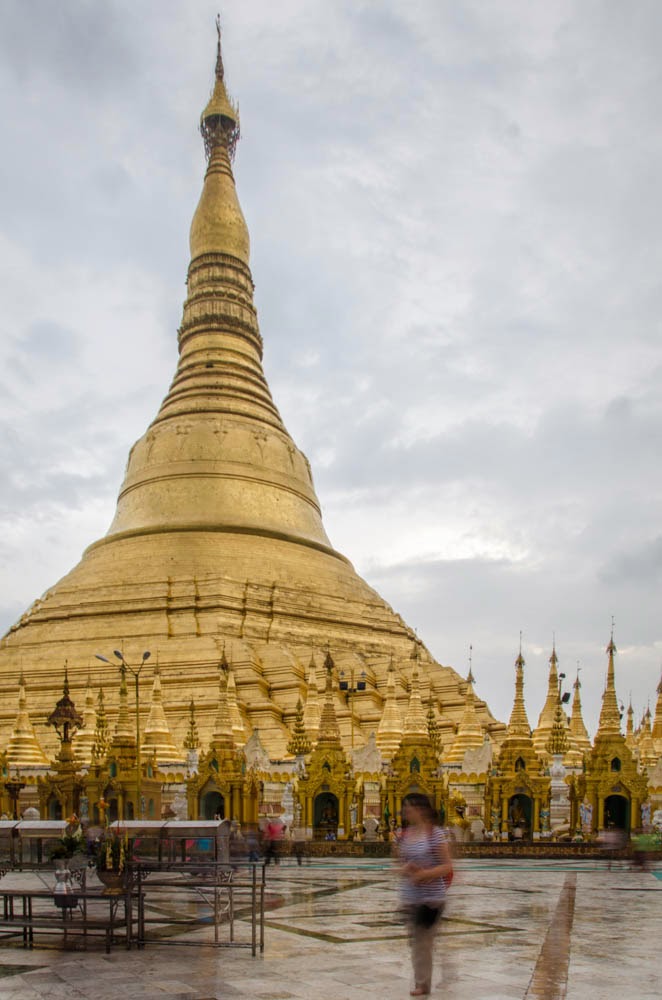 En nous rendant à Shwedagon en fin de journée, nous imaginions pouvoir profiter des derniers rayons du soleil jouant sur ses ors étincelants. La météo en a décidé autrement et c’est sous un léger crachin qui finit par se transformer en pluie torrentielle que nous parcourons ce lieu mythique. Nous n’en vivons pas moins quelques heures de pure fascination, d’harmonie et de poésie.