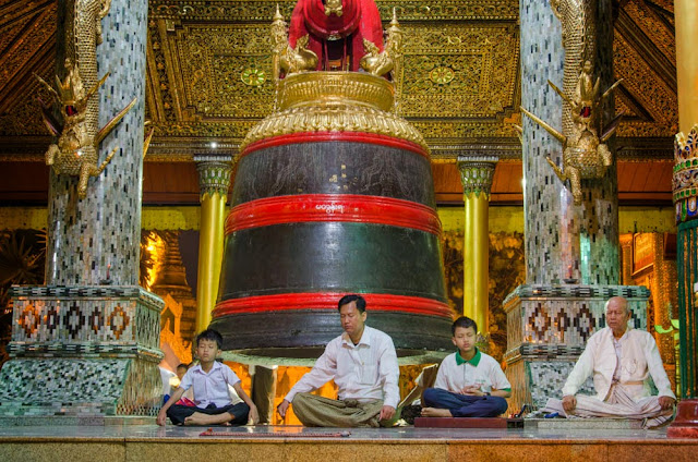La ferveur n’est pas feinte. Nous restons médusés devant ces trois générations d’une même famille qui méditent absolument immobiles pendant plus d’une demi-heure. Et en voyant cette immense pagode si vibrante de vie, d’enfants qui s’ébattent, de familles qui pique-niquent, nous nous ne pouvons nous empêcher de songer à nos églises désespérément vides, souvent tristes et sombres, où l’on ne parle qu’en chuchotant. Ici, le lieu de culte est tout autant le centre de la vie religieuse que celui de la vie sociale. Nous ferons d’ailleurs le même constat dans toutes les pagodes que nous visiterons en Birmanie.