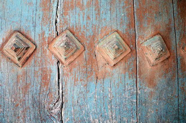 Des portes décrépies, vermoulues certes, mais ces encore si belles. Je me souviens qu’avant de les photographier, je n’ai pu m’empêcher de les caresser pour sentir le bois rugueux et la peinture s’écailler sous ma main. Du bout du doigt, j’ai suivi leurs aspérités, dessiné les contours de ces appliques métalliques polies par le temps. Mentalement, j’ai essayé d’imaginer la clé de leurs secrets…. Quels bonheurs ont-elles abrité? Quelles épreuves ont-elles enduré? Qu’ont-elles vu du temps de leur splendeur?
