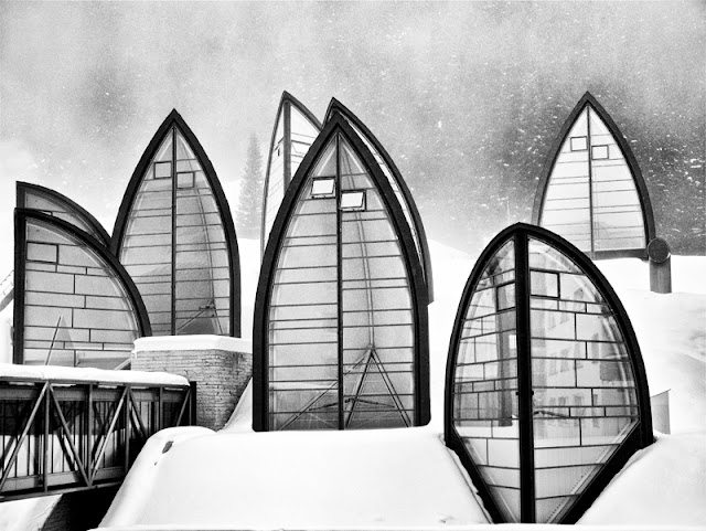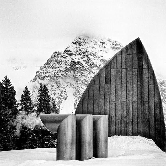 Le noir et blanc met encore plus en évidence le graphisme de cette superbe architecture qui semble parfaitement s’intégrer au lieu. Très chouette les reflets de la montagne sur les structures en verre …